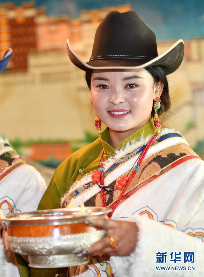2月12日,在藏北当雄县冲噶村,一名牧民盛装敬酒。