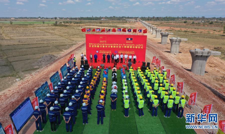2月11日,在中老铁路应急工程老挝万象站至万象南站段项目现场,中国中铁五局举行仪式庆祝蓬通特大桥实现桥梁首架。新华社发(老中铁路有限公司供图)