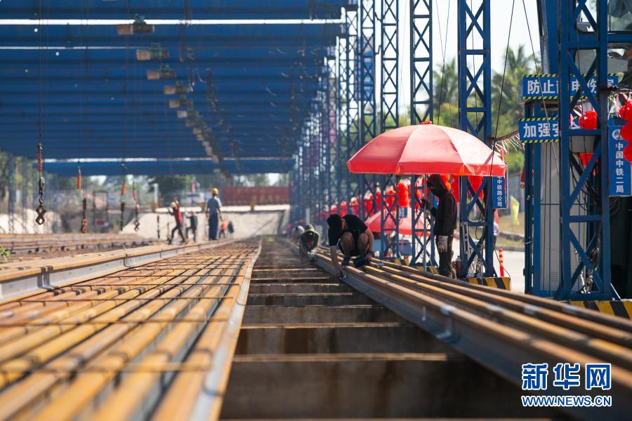 2月10日,老挝工人在位于老挝万象北郊的中国中铁二局万象铺轨基地内工作。新华社发(凯乔 摄)