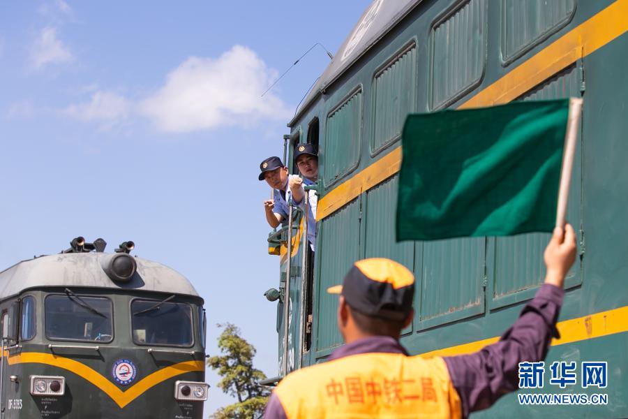 2月10日,在位于老挝万象北郊的中国中铁二局万象铺轨基地,老挝学员宋朋(右上)跟着中国师傅魏松涛学习火车驾驶呼唤应答的操作手语。新华社发(凯乔 摄)