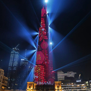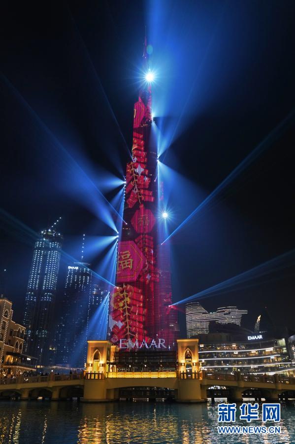 2月12日,位于阿联酋迪拜的世界第一高楼哈利法塔上演春节灯光秀,庆祝中国农历新年的到来。