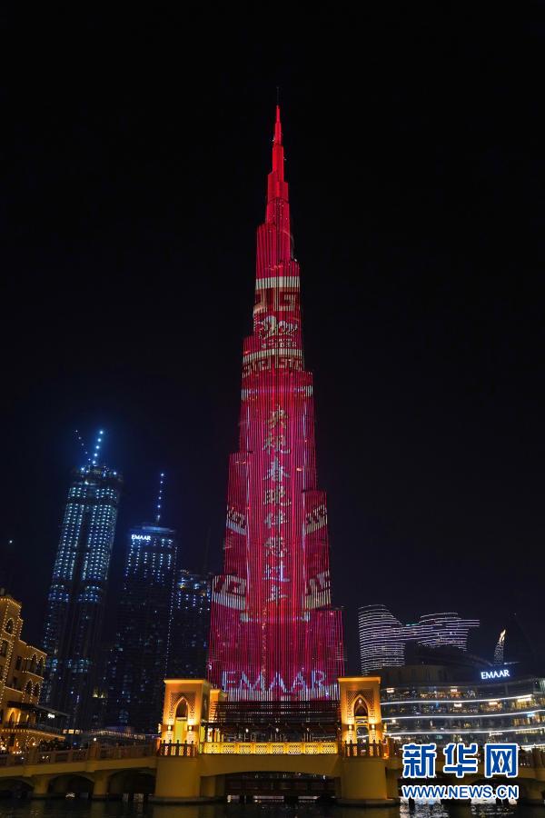2月12日,位于阿联酋迪拜的世界第一高楼哈利法塔上演春节灯光秀,庆祝中国农历新年的到来。