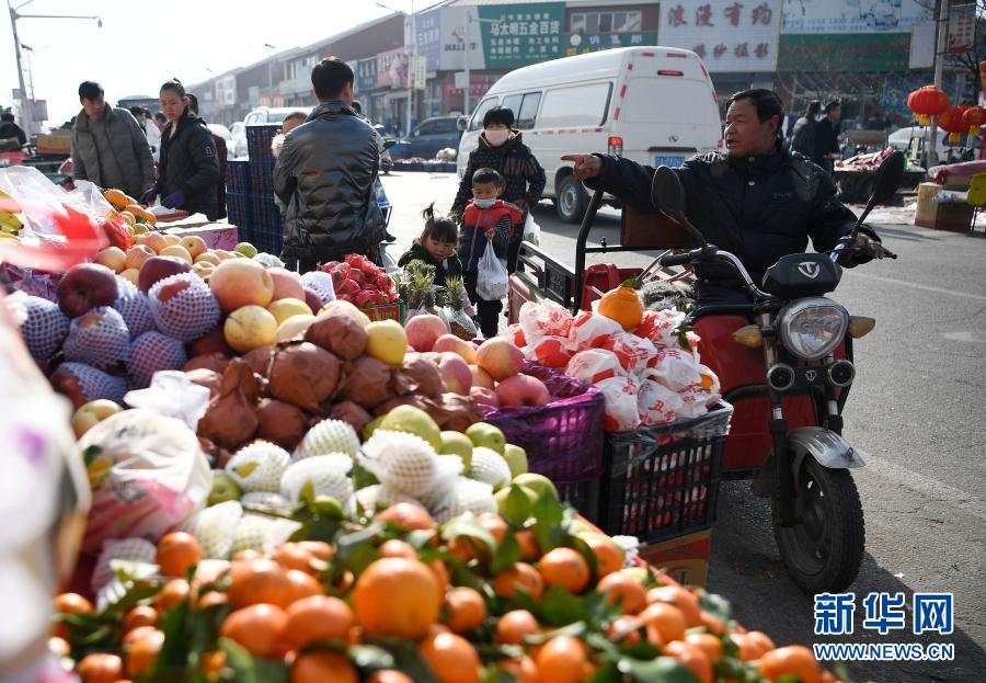 2月11日,张俊明(右一)在滨河家园移民村的集市上购买水果。新华社记者 王鹏 摄