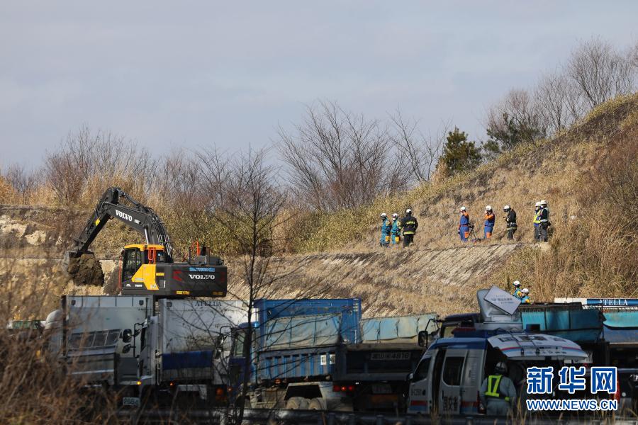 2月14日,工作人员在日本福岛县相马市清理高速路上山体滑坡坠落的土石。