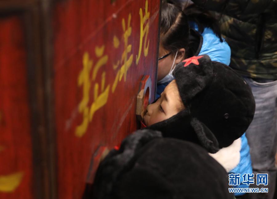 2月14日,在沈阳市和平区老北市特色风情街,拉洋片吸引小朋友观看。