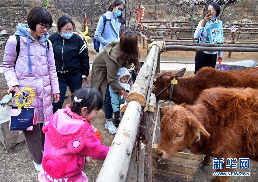 2月13日,游客在“六畜兴旺”展区给小牛喂食。