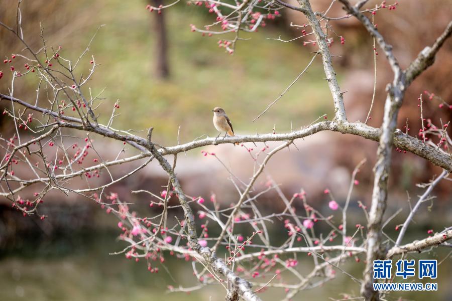 2月14日,在江苏扬州瘦西湖湖畔,一只小鸟在梅枝上停歇。新华社发(齐立广 摄)