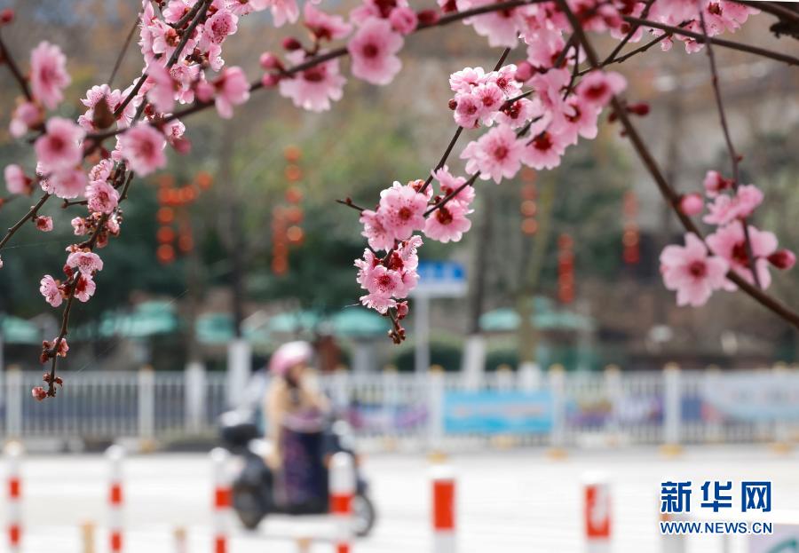 浙江景宁畲族自治县街头梅花盛开(2月14日摄)。新华社发(李肃人 摄)