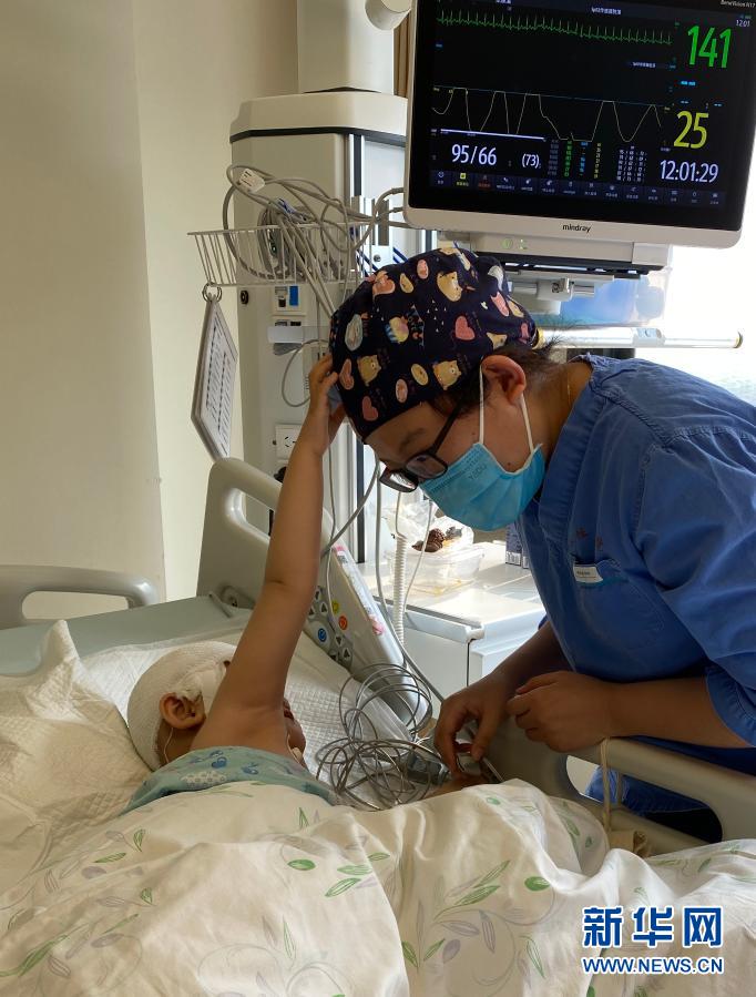 北京天坛医院ICU护士冯雅笛在医院与患者互动(2月11日摄)。新华社发(北京天坛医院供图)