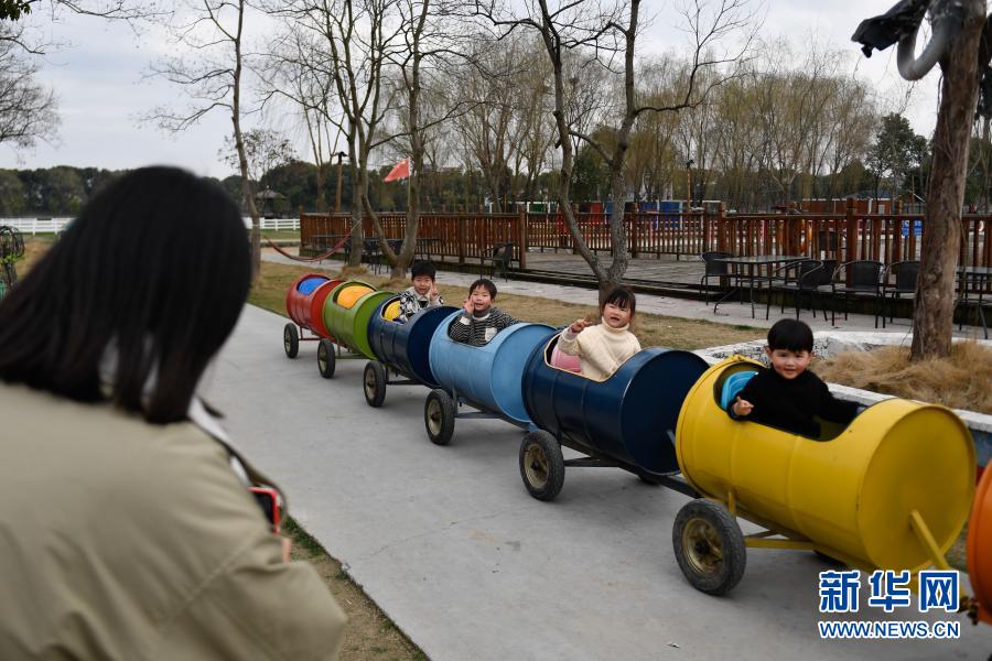 2月14日,小朋友在练市镇“莫奈庄园”体验“动力小火车”。新华社记者 黄宗治 摄