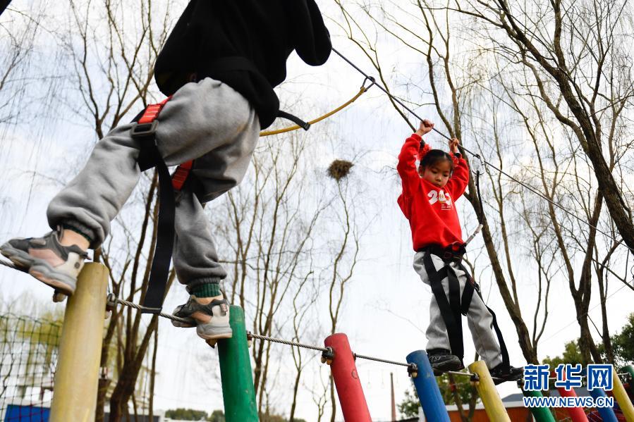 2月14日,小朋友在练市镇“莫奈庄园”体验“丛林挑战”项目。新华社记者 黄宗治 摄