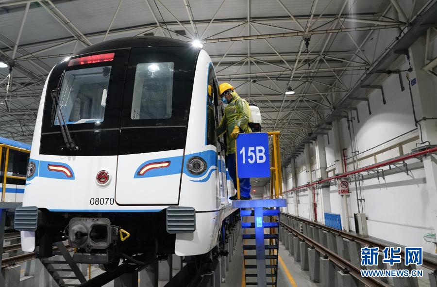 2月13日,曹理想在上海轨道交通殷行基地内对地铁车辆进行消杀作业。