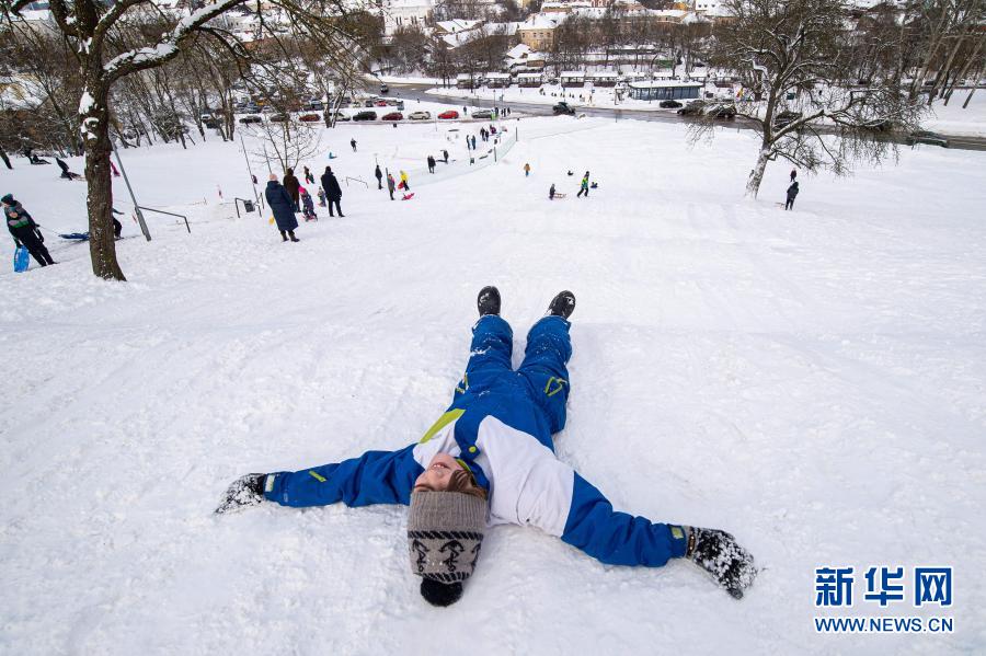 2月14日,在立陶宛首都维尔纽斯,一名孩子在雪坡上玩耍。新华社发(阿尔弗雷达斯·普里亚迪斯摄)