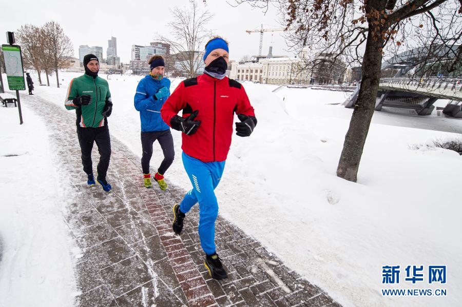 2月14日,在立陶宛首都维尔纽斯,人们在雪中跑步。新华社发(阿尔弗雷达斯·普里亚迪斯摄)