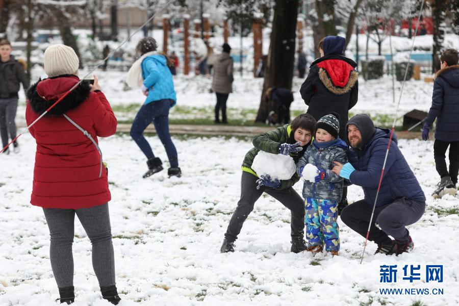 2月14日,人们在阿尔巴尼亚首都地拉那的雪地里拍照。地拉那13日夜间迎来降雪。新华社发(根特·奥努齐摄)