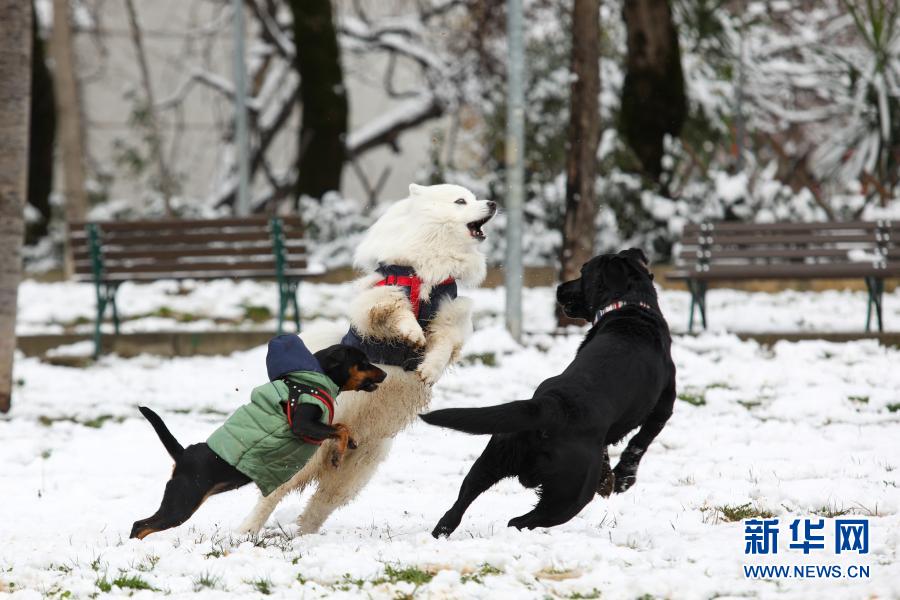 2月14日,宠物狗在阿尔巴尼亚首都地拉那的雪地里玩耍。地拉那13日夜间迎来降雪。新华社发(根特·奥努齐摄)