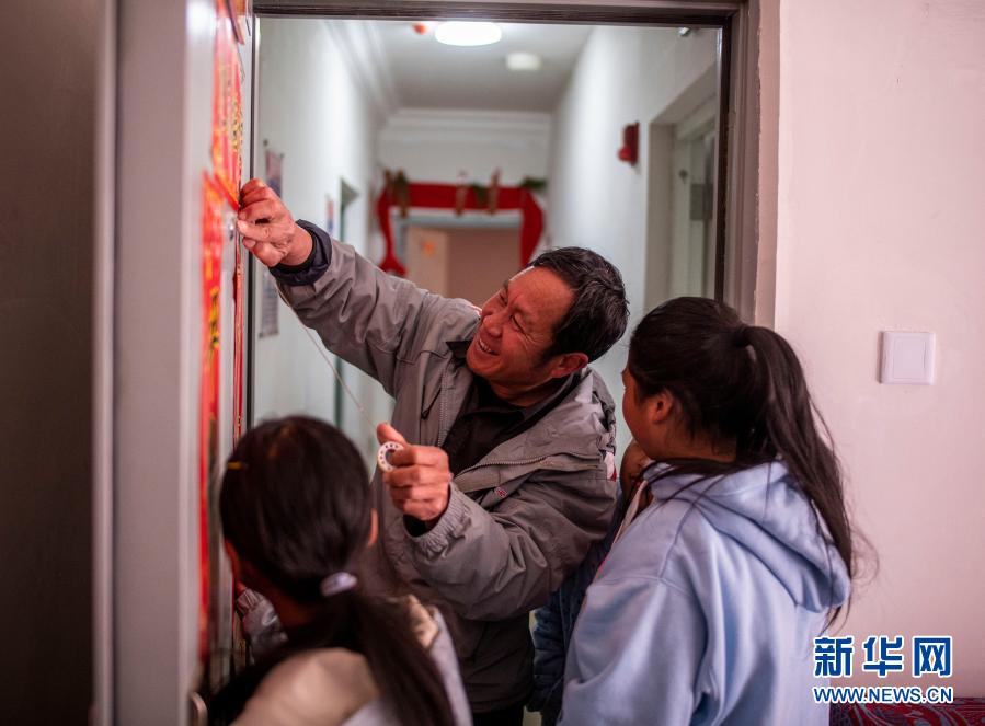 石元顺带着孩子们在新家门口贴春联(2月11日摄)。新华社记者 江文耀 摄