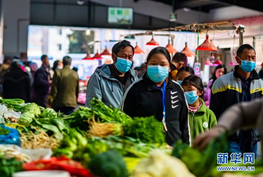 石元顺(左一)带着孩子们在农贸市场购买蔬菜(2月10日摄)。新华社记者 江文耀 摄