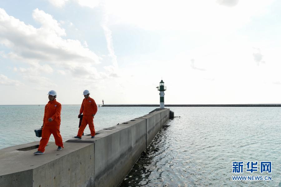 2月14日,在海南省三沙市赵述岛,傅建斌(前)和同事郭馨阳检查灯桩后离开。新华社记者 周佳谊 摄