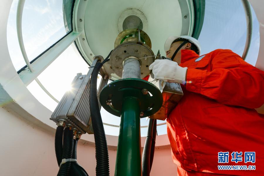 2月14日,在海南省三沙市赵述岛,傅建斌在检测灯器运行状态。新华社记者 周佳谊 摄