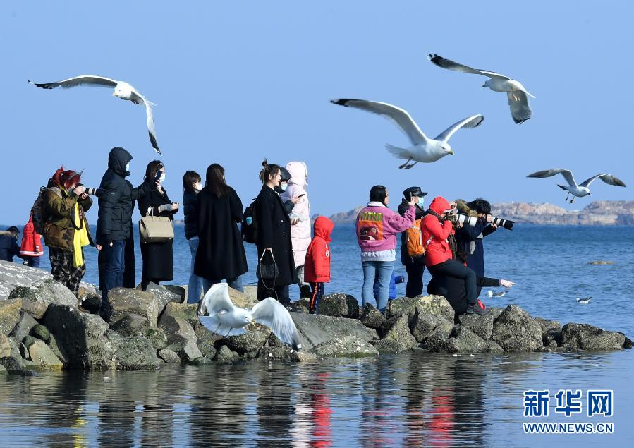 2月15日,游客在青岛市麦岛附近海边观赏海鸥。新华社记者 李紫恒 摄