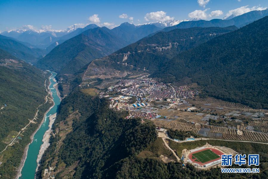 这是墨脱县城,左侧河流为雅鲁藏布江(2月13日摄,无人机照片)。新华社记者 孙非 摄