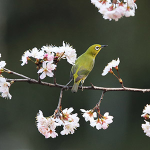 2月15日,在湖南省衡阳市雁峰区五星村,绣眼鸟在樱花树枝头停歇。新华社发(曹正平 摄)