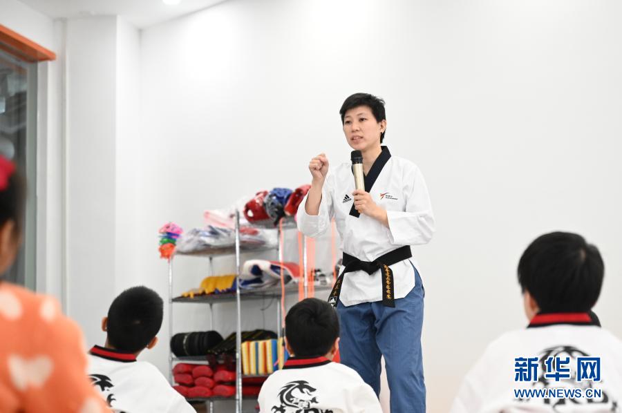 2月15日,陈燕亭在跆拳道馆给小朋友传授跆拳道知识。新华社记者 林善传 摄