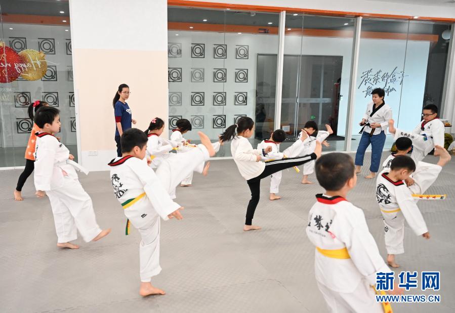 2月15日,陈燕亭(后排右二)在跆拳道馆教小朋友练习跆拳道。新华社记者 林善传 摄