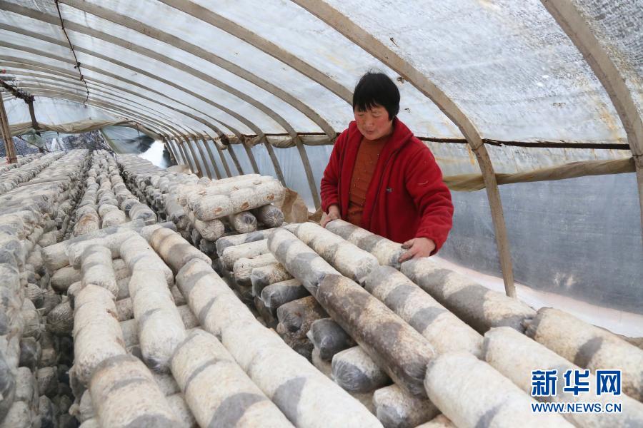 2月15日,汝阳县十八盘乡十八盘村的菇农在大棚内查看袋料香菇。