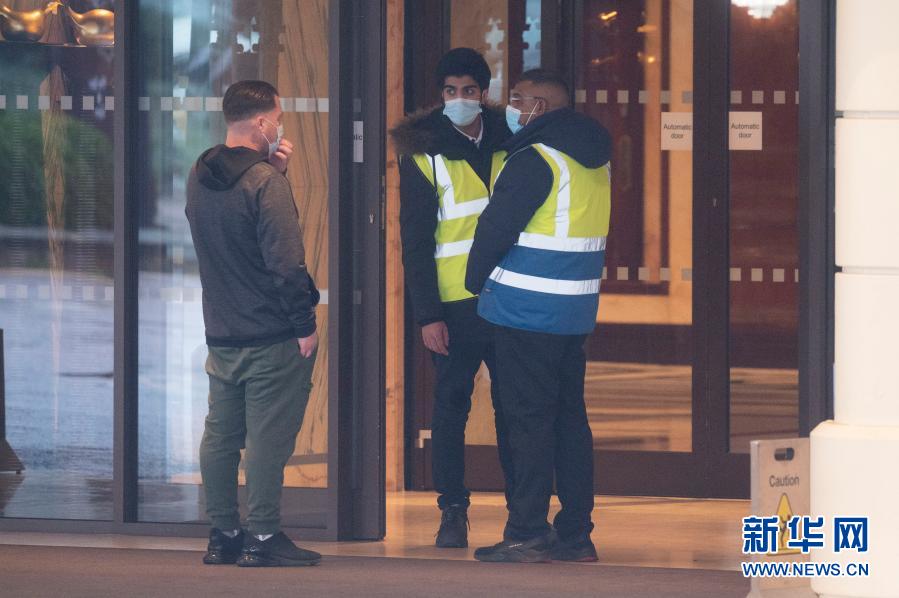 2月15日,安保人员在英国伦敦希斯罗机场附近的隔离酒店门口工作。从2月15日开始,英国将要求来自“旅行禁令名单”国家和地区的旅客入境后在政府认可的酒店等住宿设施内隔离10天。新华社发(雷伊·唐摄)