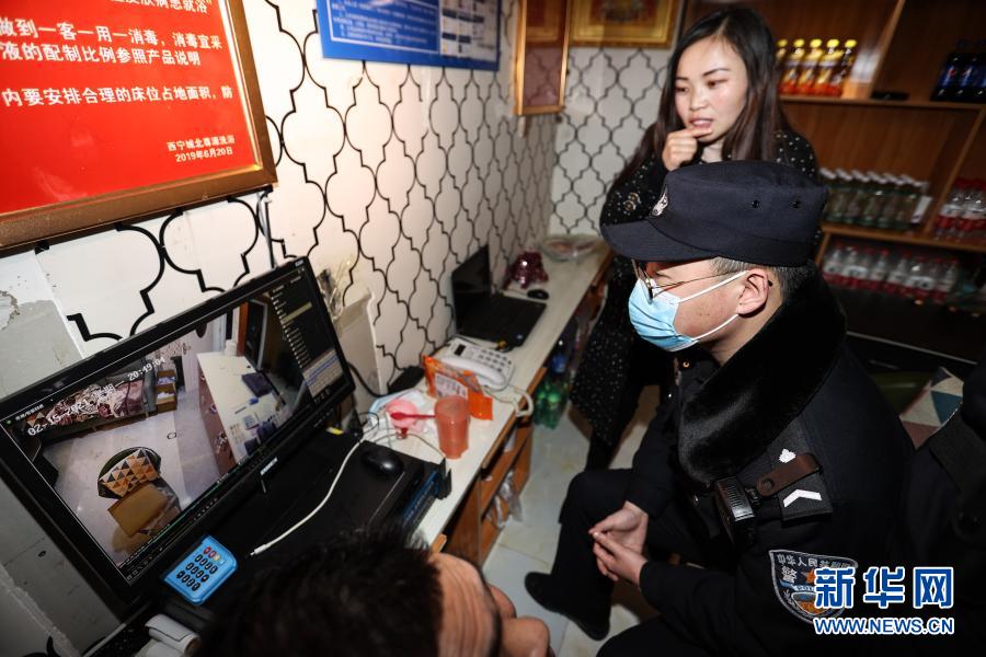 2月15日,西宁市公安局城北公安分局小桥大街派出所的值班民警在一报案地点查看监控。新华社记者 吴刚 摄