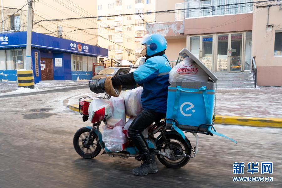 2月4日,在哈尔滨市香坊区,刘刚在配送商品。新华社记者 谢剑飞 摄
