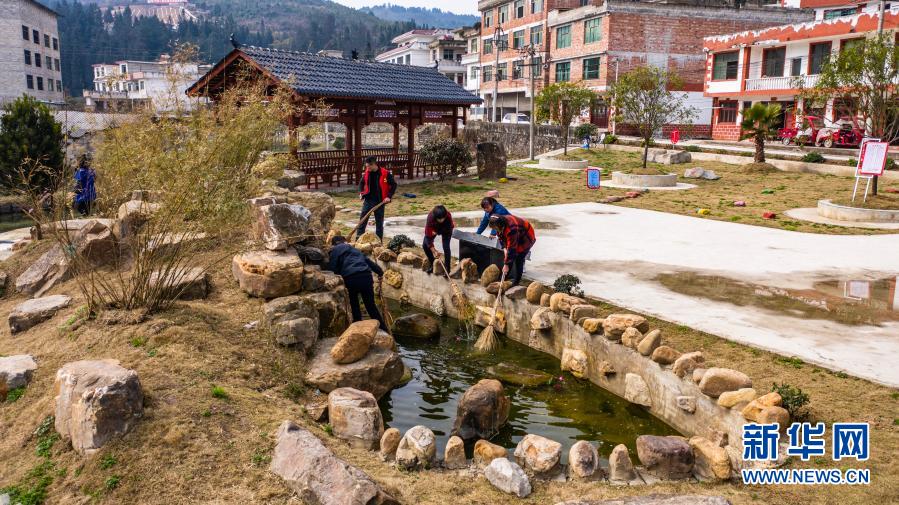 贵州省龙里县冠山街道五新村的志愿者在清理广场上的池塘(2月12日摄,无人机照片)。新华社记者 陶亮 摄