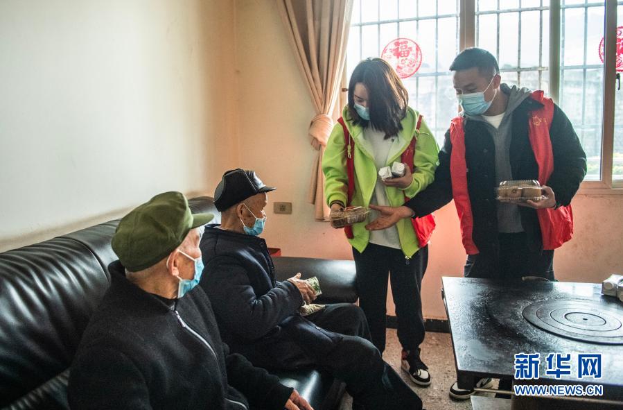 贵州省龙里县冠山街道五新村的志愿者在慰问孤寡老人(2月12日摄)。新华社记者 陶亮 摄