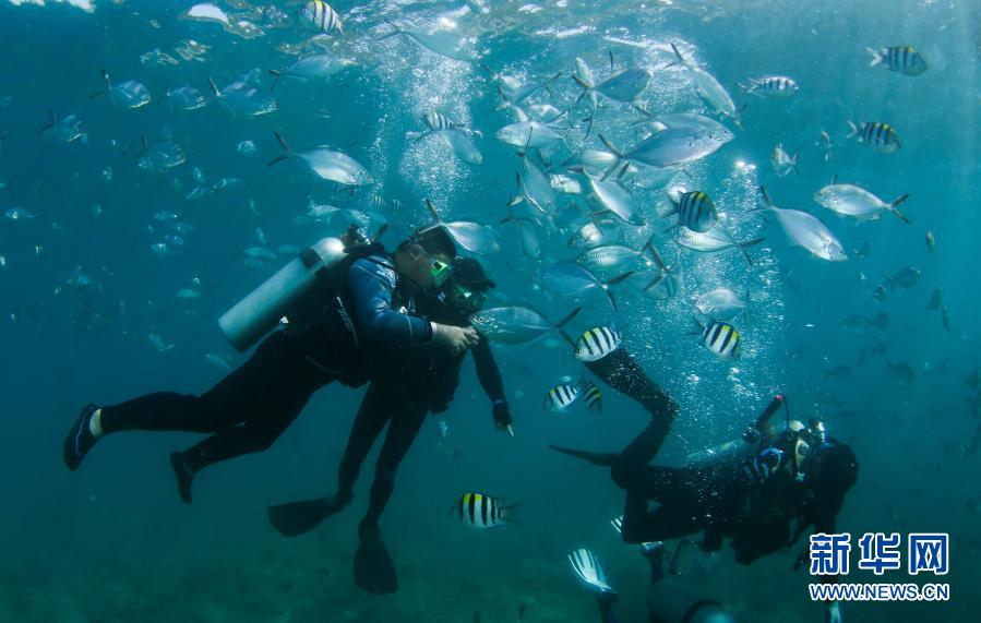 当日是农历正月初五,一些游客来到海南省三亚市蜈支洲岛旅游区体验潜水,乐享假期。