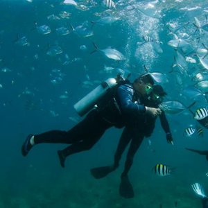 2月16日,在海南三亚蜈支洲岛海域,游客在教练的指导下体验潜水。