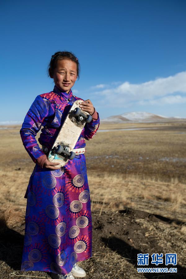 2月15日,在四川省若尔盖县黑河牧场,旦珍如让在草场上玩滑板。