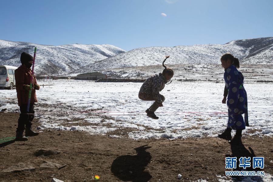2月15日,在四川省红原县阿木乡卡口村的冬季牧场上,三个小朋友在跳皮筋。