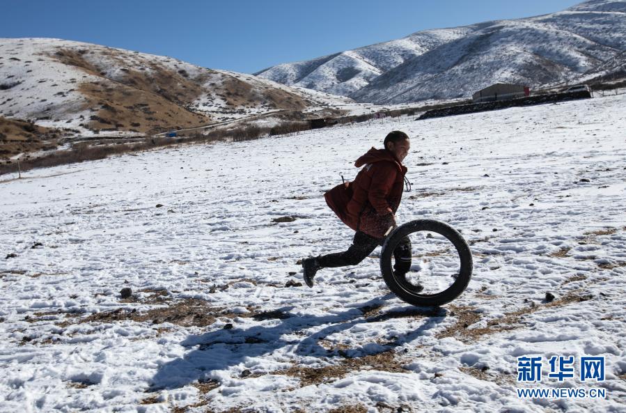 2月15日,在四川省红原县阿木乡卡口村,嘎让扎西在雪地里玩耍。