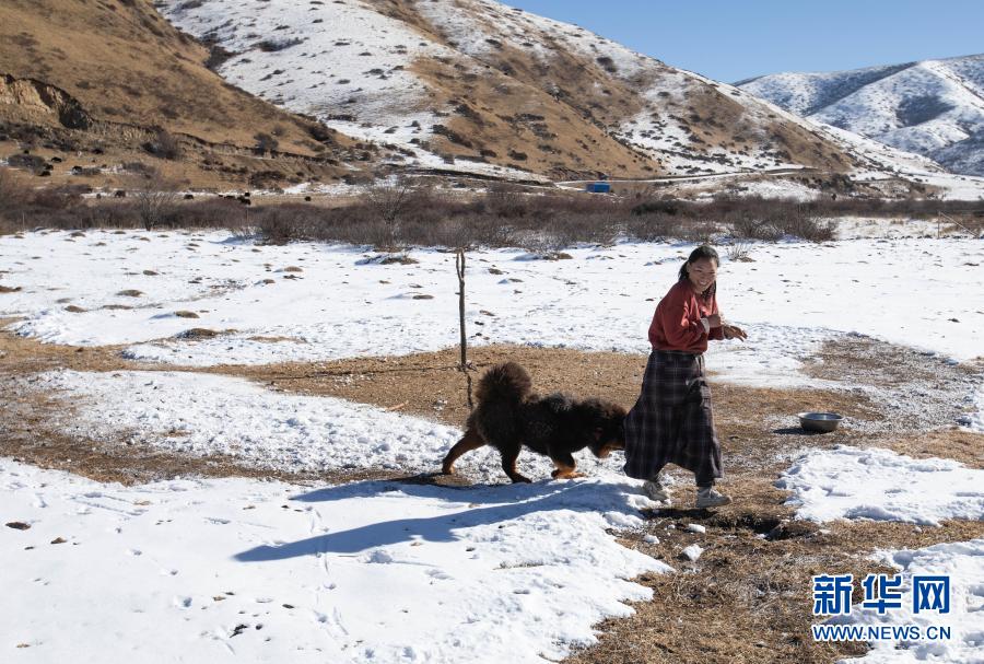 2月15日,在四川省红原县阿木乡卡口村,索朗措在和看牧场的狗嬉戏。
