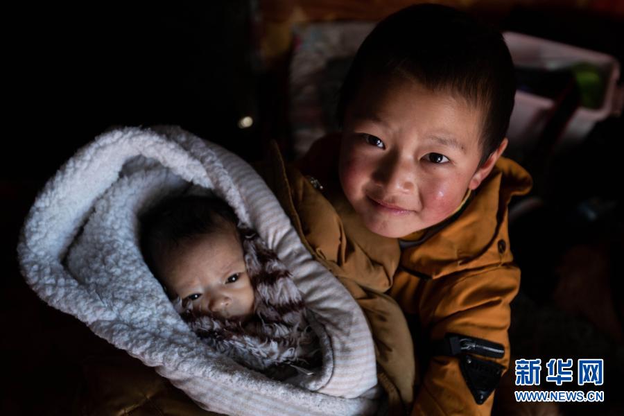 2月15日,在四川省红原县阿木乡卡口村,甲央贡嘎顿增在照看不足一个月大的妹妹。