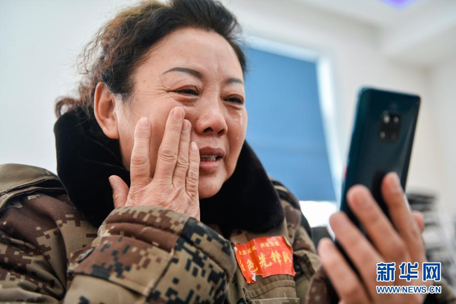 55岁的赵淑华,是吉林省通化市东昌区团结街道文化社区副主任、网格长。自1月12日通化发生疫情以来,临近退休的她毫不犹豫投身抗疫一线。小区巡逻、配合入户核酸检测、帮助居民排忧解难、保障卡点餐饮供给……为了防疫工作,她吃、住都在社区,24小时待命,近一个月没有回家。这也是东昌区800余名网格员一个月来的防疫工作常态。在这座不大的东北山城,他们用自己的付出构筑了一个个基层“抗疫堡垒”。这是2月16日,赵淑华与在长春的儿子、儿媳视频通话。这一天,她的孙子呱呱坠地。在社区忙活了一上午的赵淑华直到中午才腾出空来,通过视频看看孙子的模样。