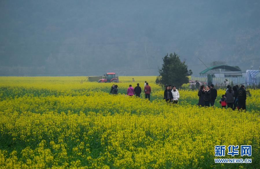 建德市下涯镇之江村黄饶半岛上,500多亩油菜花盛开,吸引了各地游客前来感受新安江边的春日美景。这是2月16日,游客在油菜花田间游览。
