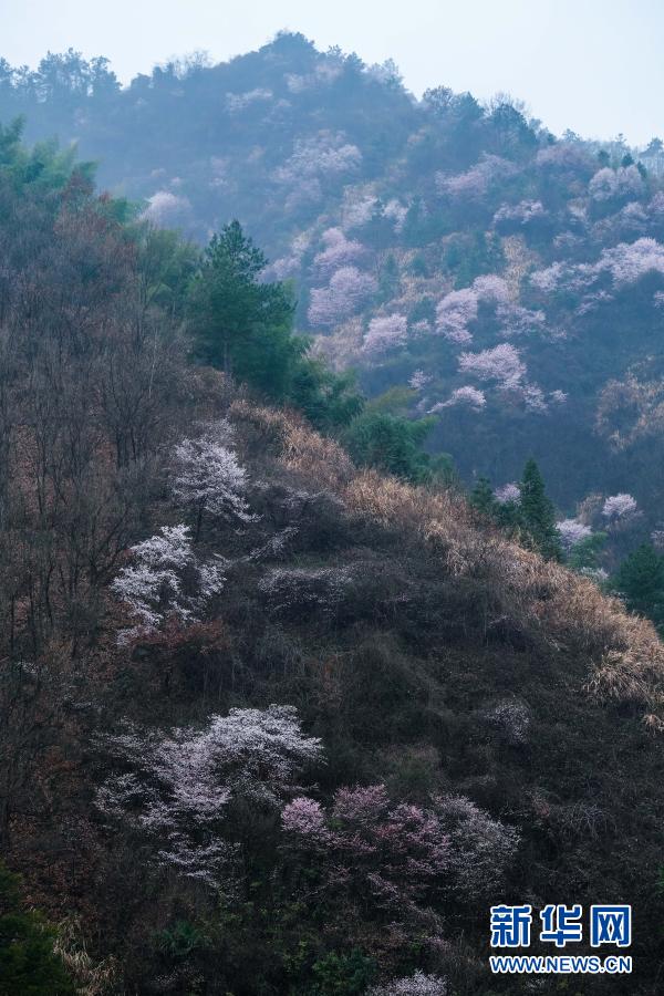 2月16日在建德市三都镇大唐村拍摄的野樱花。大唐村山野间连绵数十里的野樱花纷纷盛开,或粉或白,构成了春季美丽风景。