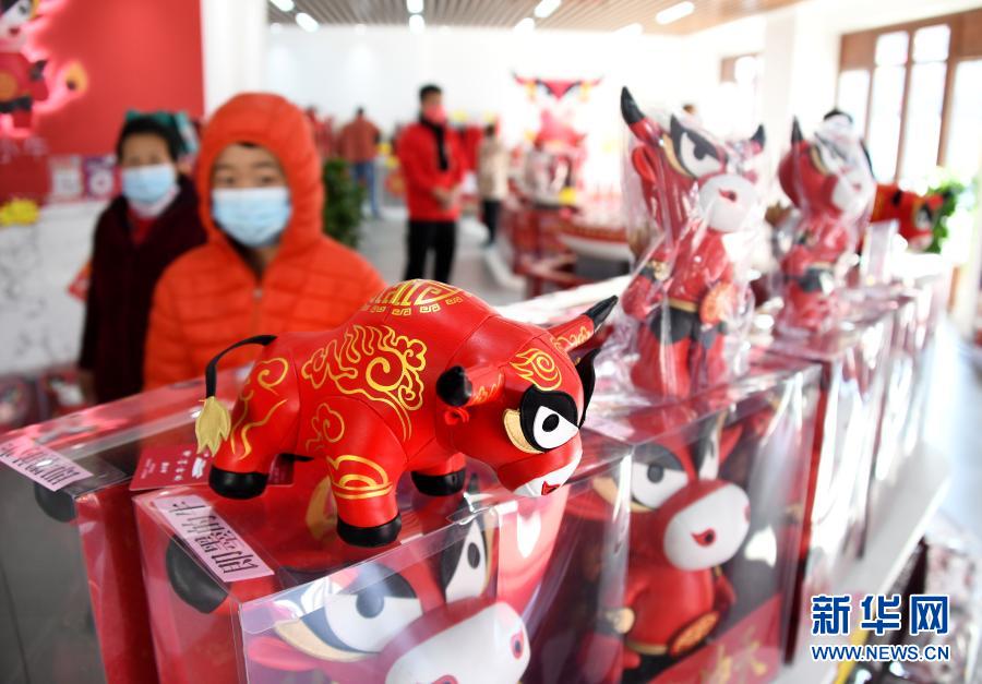 2月16日,游客在即墨古城文创礼品店选购牛年主题商品。
