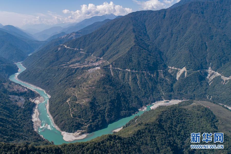 山体上的公路通往旺前罗布位于墨脱县德兴乡巴登则村的家(2月13日摄,无人机照片)。新华社记者 孙非 摄