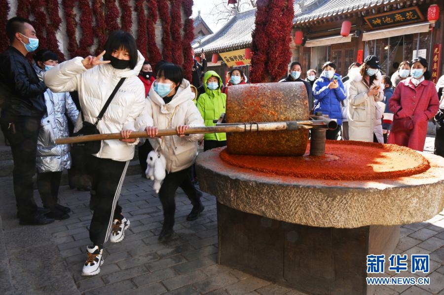 2月16日,游客在忻州古城内体验推石磨碾辣椒。