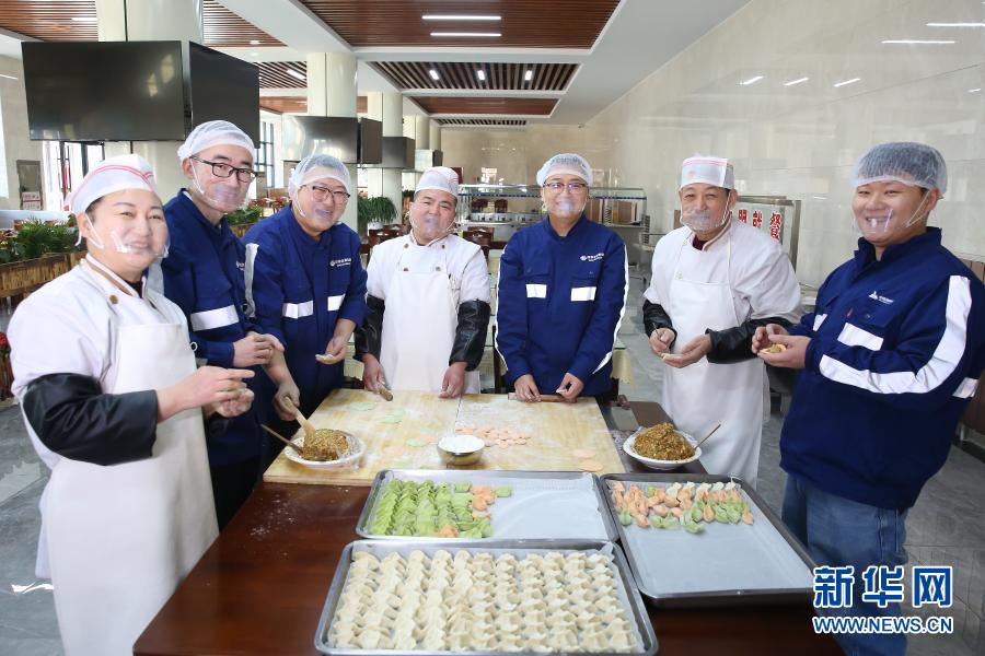 2月11日是农历大年三十,神东煤炭集团大柳塔煤矿就地过年员工与食堂工作人员一起包饺子,共度春节。新华社发(王超摄)