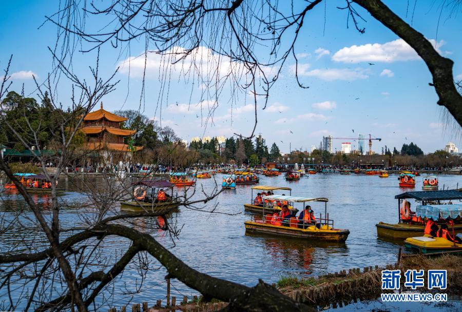 当日是大年初五,云南省昆明市大观公园里牡丹、郁金香盛开,不少游客到公园赏花、划船、喂红嘴鸥,欢度新春佳节。